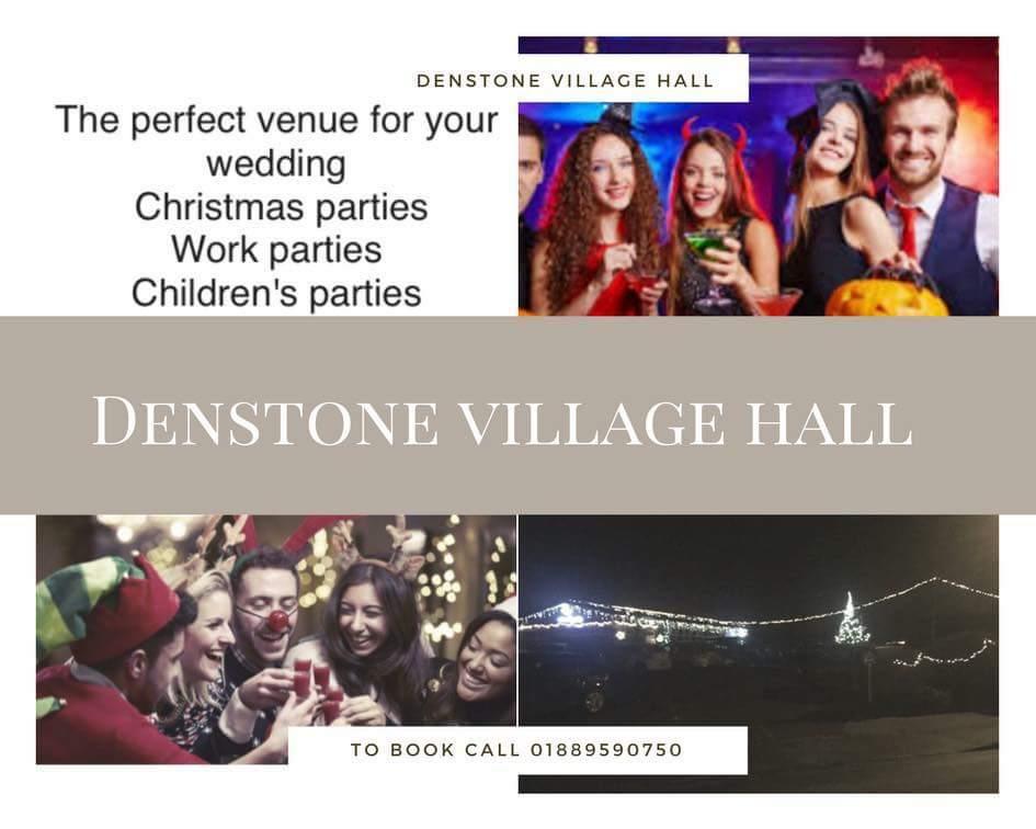 The ideal venue for your event - our modern village hall has all the facilities you will ever need. There's a fully equipped large catering kitchen, outdoor soft play area for kids parties used for bouncy castles with out door power supply, sound and lighting system for performances, a clothes show or just a bit of mood lighting, electric projector screen and projector, disable friendly, air conditioning, to book call 01889 590790 or Email denstonevillagehall@aol.com or find us on Facebook