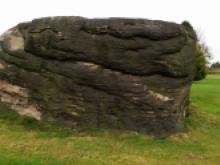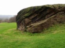 Rough Rock In the middle of one of the fairways there is a prominent block of Rough Rock showing large scale cross-bedding formed by a Namurian river. Which way do you think the river was flowing? Try to find contortions of the bedding due to water escape as the sediment compacted and solidified. The direction of the layers indicates that the Churnet once flowed in the opposite direction. More information on the geology and geomorphology of the area can be found in our Geotrail leaflets in the Walks section of the guide. |