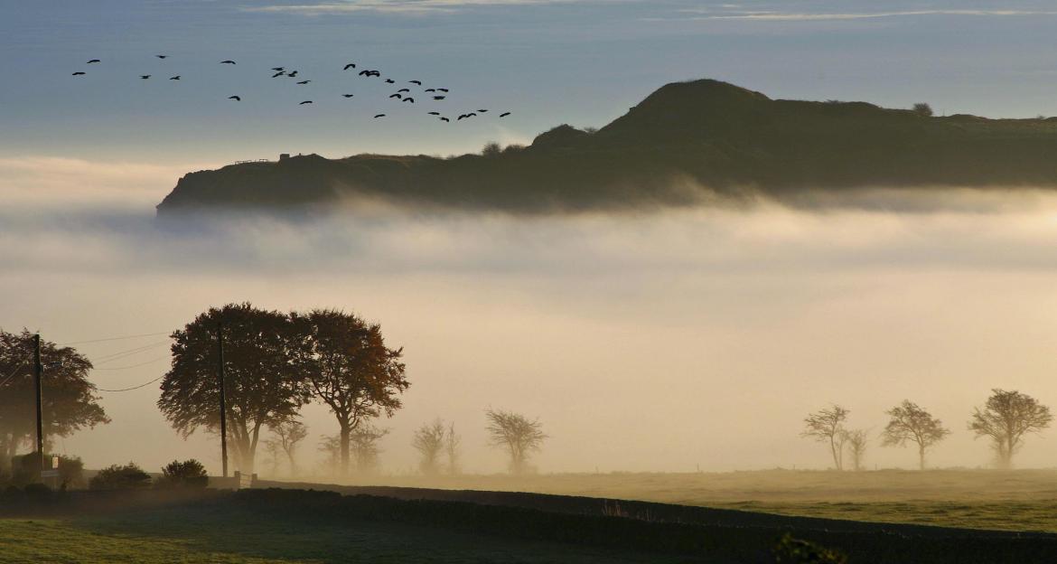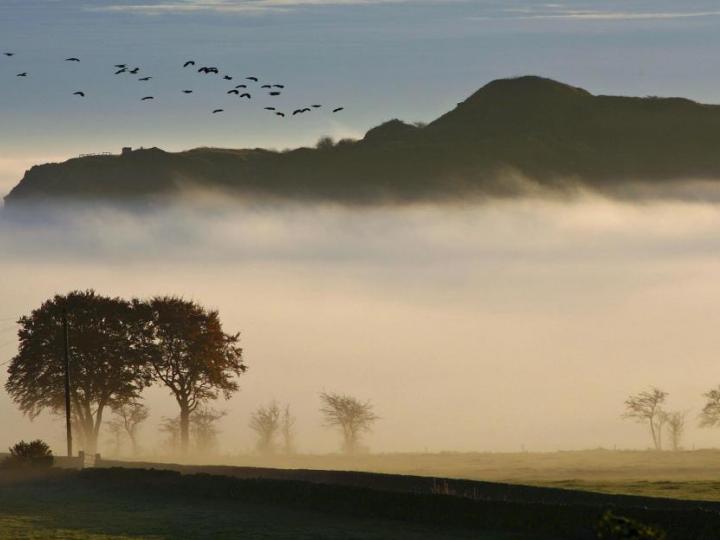 A view of Cauldon Lowe, from Stoney Lane, with the Cauldon Low quarry in the background and a flock of lapwings coming in.