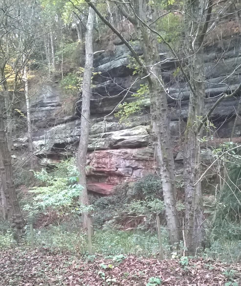 In some places along the Churnet way pathway, a disused railway track between Oakamoor and Denstone, there are dramatic cliffs. Be sure to look at this one just before Lords Bridge.