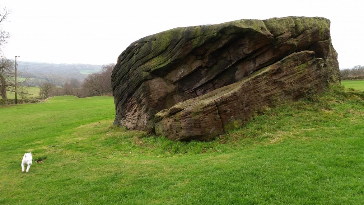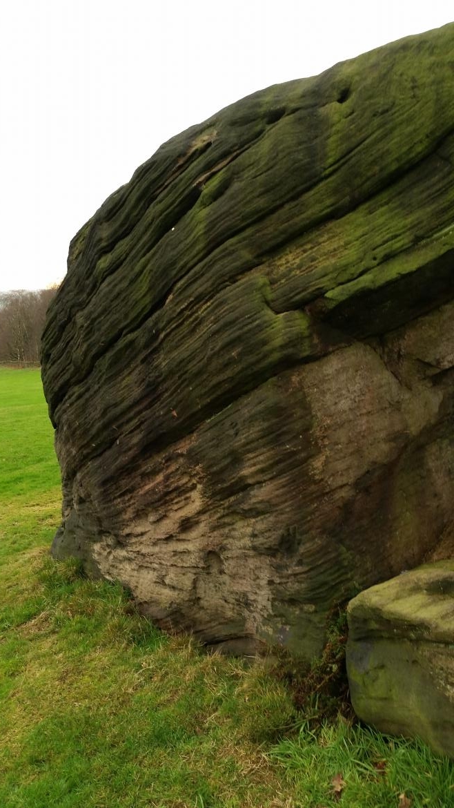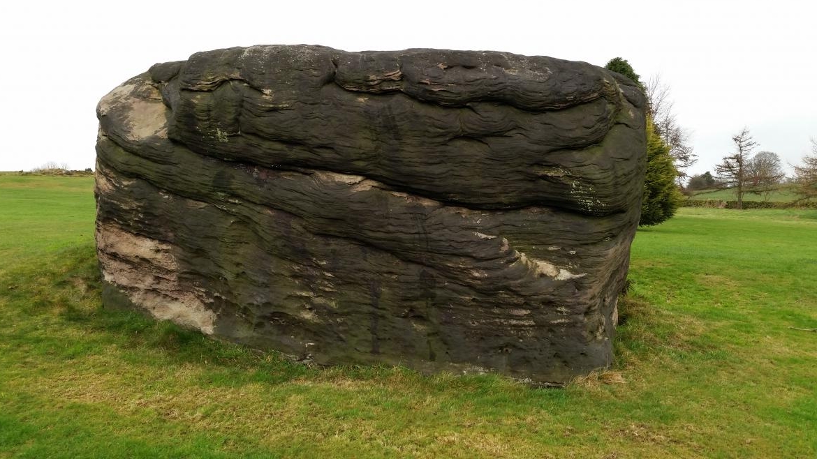 In the middle of one of the fairways there is a prominent block of Rough Rock showing large scale cross-bedding formed by a Namurian river. Which way do you think the river was flowing? Try to find contortions of the bedding due to water escape as the sediment compacted and solidified. The direction of the layers indicates that the Churnet once flowed in the opposite direction.